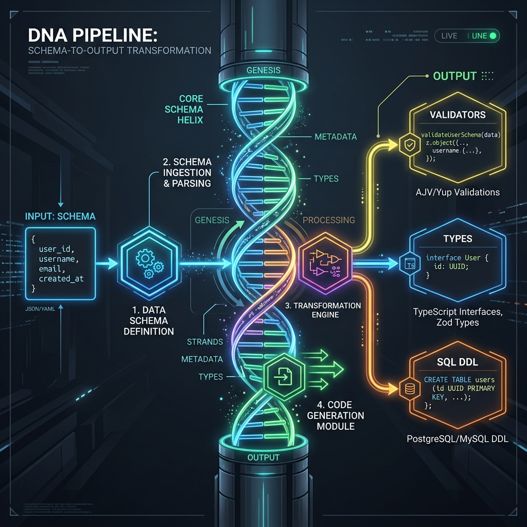 The engine runs that schema through a transformation layer. It generates the repository schemas, validators, and types simultaneously. No more bugs where the validator, types, and database schemas disagree.
